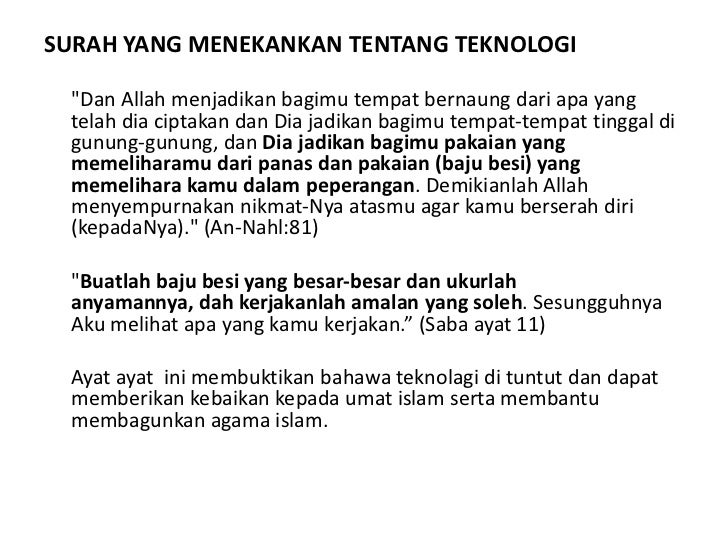 Jadi beginilah pandangan mengenai sains dan teknologi dalam perspektif Al-QuranApakah kalian sudah memahami dan tau lebih dalam setelah membaca artikel ini. Kaedah Fiqah dalam Sains Teknologi dan Kejuruteraan Pengenalan Kaedah fiqah merupakan satu prinsip umum yang boleh dijadikan sebagai satu panduan umum dalam pembinaan hukum-hukum Islam yang terutamanya apabila terdapat masalah-masalah baharu yang memerlukan keputusan hukum yang cepat. Rumusan Islam menerima teknologi yang memberi manfaat Islam menolak teknologi yang bawa kerosakan Berdasarkan etika dan prinsip dasar Islam Tujuan utama.
